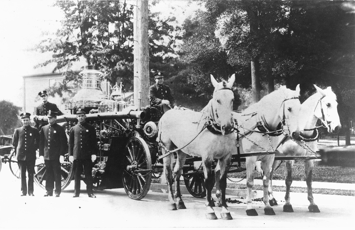 Proud Los Angeles Fire Department Firefighters in front of their early 1900’s steamer with three gorgeous white horses ready to respond!